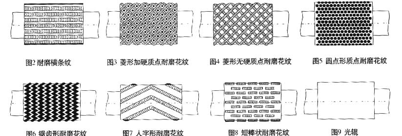 目前國內(nèi)外常用的輥面耐磨花紋形式如圖所示,客戶可根據(jù)具體情況自主選擇;